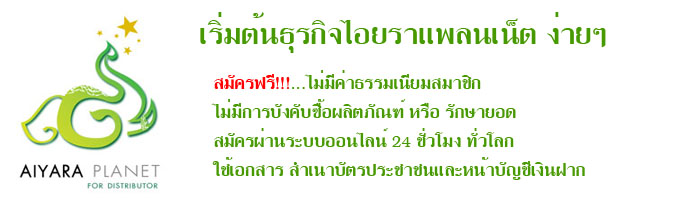 10 ขั้นตอนกับการสมัครสมาชิกร่วมกับบริษัท ไอยราแพลนเน็ต จำกัด ง่ายๆ สามารถทำตาได้เลยทุกวันนี้ไอยราแพลนเน็ตมีระบบรองรับมากมายการทำงานทางด้านออนไลน์ค่อนข้างไวมาก คุณสามารถสมัครเป็นตัวแทนจำหน่ายทางออนไลน์ได้ 24ชม. รวมถึงแนะนำการสมัครสมาชิกให้กับบุคคลที่สนใจคีย์สมัครเองได้ง่ายๆ ผ่านหน้าจอคอมพิวเตอร์ หรืออุปกรณ์เชื่อมต่ออินเตอร์เน็ตได้ ทำให้ทำงานง่ายมากยิ่งขึ้นจริงๆ สนใจดูข้อมูลโปรโมชั่นสินค้า อัปเดทใหม่ๆ ได้ที่